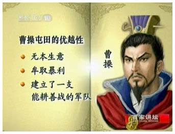 曹操的屯田制,证明他不愧为一个深谋远虑的政治家。曹操在颁布他的《屯田令》的时候说了这样一句话,他说:“定国之术,在于强兵足食。”就说怎样才能平定天下呢?第一要强兵,第二要足食,兵不强、(食不足)你何以得天下?而其他的那些诸侯就没有这个战略眼光,后来《魏书》有这么一段话: