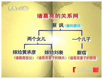 第二个,诸葛亮有一个关系网。诸葛亮的岳母是襄阳地区最大的豪族蔡讽的女儿,蔡讽两个女儿、一个儿子,这两个女儿一个嫁给了诸葛亮的岳父,一个嫁给了荆州牧刘表,他这个儿子叫蔡瑁,也是权重一时的人。也就是说荆州地区最高行政长官是诸葛亮妻子的姨父,荆州地区重要的官员是诸葛亮妻子的舅舅,所以这个关系网是很了不得的。而这件事情又有一段佳话,诸葛亮的岳父叫黄承彦,这个人非常欣赏诸葛亮,有一天他就去找诸葛亮跟他说,孩子啊,我有一个女儿长得很丑,但是非常有才华,你愿意娶她吗?诸葛亮说愿意啊,黄承彦马上回家就把他女儿装到车上送诸葛亮家里去了。