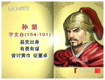 江东集团是一个割据一方的地方政权,它的创始人是孙坚,奠基者是孙策,发展壮大使它成为一个独立国家的是孙权。孙坚字文台,史书上说他是孙武之后,这个靠不住,又说他们家世代仕吴,这个大概是靠得住的。孙坚这个人从小就胆识过人,有一次他和他的父亲一起出门坐船,来到一个地方准备靠岸,发现江上很多船都不敢靠岸,为什么呢?因为码头上有一伙强盗正在那儿分赃。当时孙坚十七岁,站在船头看了一下,说这一伙毛贼,可以干掉他们嘛!拎了一把刀他就上岸了,上岸以后他就指指划划。强盗一看,说哎呀,官兵来了,这个小伙子是个指挥官,正在吩咐,什么这边抄后路啊什么东西。强盗就放下赃物,一哄而散,孙坚提起刀就跑,追上一个,啪,头砍下来。那么这件事情就轰动了,轰动了以后,地方政府就任命他做县尉,也就是副县级的公安局长,后来又升到县丞,那就是副县长。但是真正让天下人都知道孙坚,是在董卓之乱的后面。