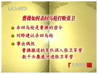 但是到底是怎么回事呢?这个史书上记载它有很多很多的说法:一个说法说杀回马枪是曹操的密令,那就是曹操决定杀回马枪;那么第二种说法呢,说是刘晔的建议,刘晔主张杀个回马枪;第三种说法,是事出偶然,就是没打算杀回马枪。这个事出偶然它又有两种说法,一种说是曹操的部队撤退的时候稀里糊涂地开进了张卫的军营,这个张卫这个人一听说是曹操的军队来,他也不知道曹操是撤退,以为是来进攻的,一哄而散,就这么个事,这是一种说法。还有一种说法,说误入张卫军营的不是曹操的军队,是什么呢,数千头麋鹿,山上的那个梅花鹿不知道莫名其妙地几千头冲到张卫军营里去了,张卫的军营就大呼小叫说,曹操来了,一哄而散,那么曹操的军队一看他一哄而散,趁机就杀回来了。反正是搞不清楚了,就是这场战争是稀里糊涂地把它打下来了。
