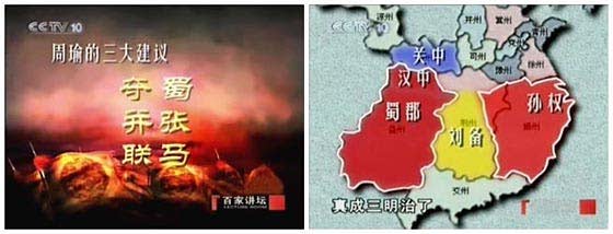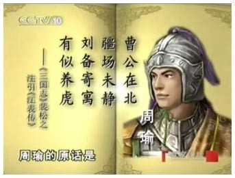 那么周瑜这边呢,一计不成又生一计,周瑜看软禁刘备不了,自己来到京口对孙权提出三项建议,就是夺蜀、并张、联马,什么意思呢?就是夺取蜀郡,吞并张鲁,联合马超。这个主意表面上看起来是对付曹操的,因为周瑜最后说的话是“北方可图也”,但是它是什么呢?它是明功曹操、暗算刘备,你想想看,如果周瑜的这个计划实现了,蜀郡拿下了,汉中也拿下了,还联合了关中的马超,那么等于说是西部地区归孙权了,江东的东部地区也归孙权了,刘备夹在当中真成三明治了。何况我们也不知道这个周瑜去进攻蜀郡的时候,会不会打到一半的时候调转枪口来对付刘备,因为在江东集团周瑜是坚持要干掉刘备的。
