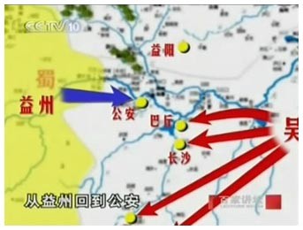 所以这个时候孙权就不干了,在建安二十年派诸葛亮的哥哥诸葛谨去向刘备讨还荆州,刘备的回答是这样的:哎呀,现在我正在打凉州的主意,等我把凉州打下来了我就把荆州还给你。孙权说这是什么话?这明明是赖皮嘛,凉州,天知道你凉州什么时候打下来!孙权说那不管,这个荆州是我的,下一道命令,往这个长沙、桂阳、零陵三郡派太守,派官员。这些官员拿着孙权的任命书就去上任了。这个时候荆州谁在管着呢?关羽,你想关羽是什么人,关羽听你的?关羽吃你这一套?关羽下道命令,把孙权派的这些官员都给我轰出去,又把他轰回去了。孙权勃然大怒,下令吕蒙率军两万进军长沙、桂阳、零陵三郡,鲁肃率兵一万进驻巴丘,和关羽摆开阵势,文的不来武的来。刘备这个时候在哪儿?在益州,刘备听到这个消息也知道这个事情不好,于是亲率精兵五万从益州回到公安,公安就是现在湖北的公安;然后命令关羽率军三万进军益阳,双方拉开架式,一场大战一触即发。