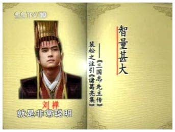第一,刘备临终的时候给刘禅有一封诏书,诏书里面提到了诸葛亮对刘禅的评价,什么评价呢?四个字:“智量甚大”,翻译成现在的话说就是非常聪明,非常有前途。如果说刘禅是一个弱智,那岂不等于说诸葛亮说了假话?当然有人说,这是一种善意的假话,刘备因为快去世了嘛,怕刘备不放心,安慰安慰他。就像我们医生对病人一样,这个病人已经病入膏肓了,可能过两天就要死了,病人问医生你看我还有救吗?医生说没问题没问题,是吧,你尽管放心治疗,你这个肯定能治好。其实治不好,这叫善意的谎言。但是呢,看当时的情况,也不至于说是“智量甚大”,如果刘禅弱智的话,诸葛亮会用另一种方式来安慰刘备。这是第一点。