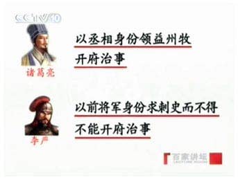 但是实际上如何呢?实际上他和诸葛亮相比是处处不如。我们也来看一个表,这是刘备托孤以后李严和诸葛亮权力、地位的比较。诸葛亮怎么样呢?返回成都,主持朝政,“政事无巨细,咸决于亮”。李严如何呢?留镇永安,远离朝廷。那么这样一来的结果是什么呢?就是这个王朝的大事小事都由诸葛亮说了算。而李严呢,无法参与朝政,难以辅佐少主,疏远了官场的关系,失去了表现的机会。因为他长期在外面,远离了政治中心,这样他逐渐地就被政治中心所遗忘、所抛弃。这是第一点不如。第二点,诸葛亮以丞相的身份领益州牧;而李严呢,李严当了前将军以后曾经要求当一个刺史,没有得到批准。第三点不如呢,诸葛亮是开府治事的。我一再强调开府不开府有很大的区别,开府就意味着有自己独立的办公系统和独立的权力,而李严是没有的。而且李严提出了这个要求,也没有得到批准。所以李严表面上步步高升,实际上处处不如。