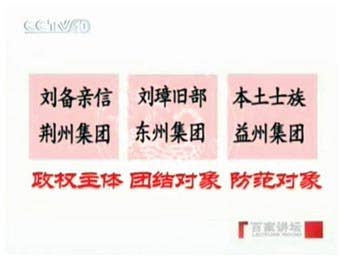 搅在一起的结果是什么呢?是刘备称帝,基础不牢,再加上夷陵兵败,国本动摇。在刘备托孤的时候,蜀汉政权最大的忧患,不在曹魏,不在孙吴,而在自己内部。这是刘备最担忧的。而刘备的想法是什么呢?第一条,后来居上,不容颠倒。我们这个最后来的外来势力一定要占主导地位,这个是不能动摇的。在此前提下,以我为主,兼容三方,就尽量地把这另外两股势力也把它融合起来。所以刘备的这个时候的国策应该是这样的几句话:巩固新人地位,稳定旧人情绪,协调新旧关系,消除新旧界限。这样蜀汉政权才能够长之久安。所以我们再来看这张表就很清楚了,就是对于蜀汉政权来说,刘备亲信组成的荆州集团必须是政权主体,刘璋旧部组成的东州集团是团结对象,本土士族组成的益州集团是防范对象。
