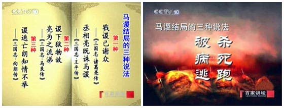 首先第一条,马谡是不是被诸葛亮杀了,就弄不清楚。根据《三国志》的记载,马谡竟然是下落不明。为什么呢?我们知道在《三国志》当中,马谡是没有传的,那么马谡的结局只能到别人的传里面去看。《诸葛亮传》的说法是:“戮谡已谢众。”也就是说马谡被诸葛亮杀了。这个事有个旁证,在王平传,《王平传》说:“丞相亮既诛马谡”,也说马谡被诸葛亮杀了。《马良传》的说法是:“谡下狱物故,亮为之流涕。”就马谡被诸葛亮关进了监狱,病死在监狱里面;诸葛亮得到消息以后,哭了。第三种说法见于向朗传,《向朗传》的原文是:“谡逃亡,朗知情不举。”按照这个说法马谡是跑了。也就是说关于马谡的结局有三种说法:被诸葛亮杀了,病死在狱中,跑了。三种说法都见于《三国志》,也就是说同一个人陈寿,同一本书《三国志》,三种说法。历史的真相真是很难弄得明白。