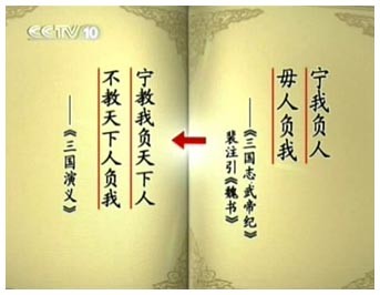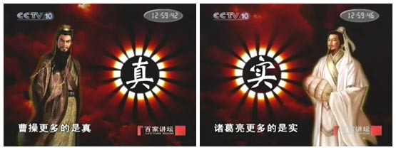 第二个原因就是文艺渲染。由于这两个人的历史形象本身就存在着差别,到了后代的文学艺术作品当中,这种差别被放大了。比方说曹操讲:宁我负人,毋人负人。八个字,还不是正史记载,到了《三国演义》里就变成了:宁教我负天下人,不教天下人负人。放大了,本来人家话是有对象的,宁肯我对不起他,不可他对不起我,是一对一的,加上一个天下人,变得普天下人了,放大多少倍?所以他的奸诈和残酷在文学艺术作品当中是被放大了的。另一方面,诸葛亮的智慧在文学艺术作品中也被放大了,什么草船借箭啊,借东风啊,空城计啊,编出多少故事来,因为这一段实际上在史书的记载上是空白啊。
