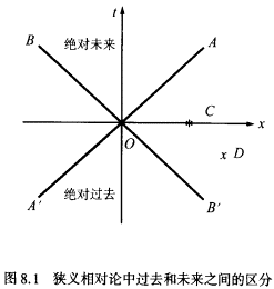 观察者位于这幅图中的O点,他的未来包含在“锥体”BOA中,他的过去包含在锥体A'OB'中,这些锥体由光速c所确定,锥体内速度小于c,锥体外速度大于c,从而不可能实现。在这幅图中,事件C与O同时,而事件D先于O。但这一结论纯属约定俗成,因为洛伦兹变换将旋转轴t、x,于是,D可能与O同时,C可能落后于O。洛伦兹变换修正了同时从C或D出发的事件以光速传递信号相联系,它们也将于后来的时刻t1和t2抵达。结果,O只能收集有限的数据,这与已由米斯拉(Baidyanath
