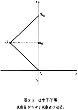 当然,相对论引入了一些很有趣的新效应,诸如著名的双生子佯谬。一个双生子留在地球上点x=0处,另一个双生子乘飞船离开地球在t0时刻改变方向(O在坐标系中是静止的),在2t0时刻返回地球,那位飞行双生子的时间间隔大于2t0。这就是爱因斯坦惊人的时间延缓预言,它已被使用不稳定粒子所证实。所以,这些双生子的寿命依赖于相对论所预言的路径。在第七章,我们讲过时间流依赖于事件的历史,但是牛顿时间是普适的,与历史无关。现在,时间本身变为依赖于历史了。