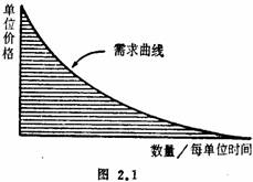 一个特定群体对某一特定商品的需求曲线可以定义为点的轨迹,在每一点上显示着在某一特定价格下,每单位时间这个群体将购买的该商品的最大数量。这样做表示了想把某一时刻的商品流通速率与价格联系起来的企图。对于许多问题,把需求曲线作为划分两个空间的界线是有用的,在给定的需求条件下,需束曲线左边空间里表示的点是可以达到的,就是说,需求者可能乐意在该点所表示出的价格下买所表示的数量;需求曲线右边空间里表示的点是不可能达到的,也就是说,需求者将不愿在所表示出的价格下买表示出的数量(见图2.1)。