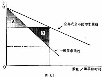 当把需求曲线视为界线时,在给定条件下的需求曲线上的一点代表着在单位时间内、一定价格下,买主可能购买的最大数量。简言之,人们须列举出需求者所能考虑的各种选择。按照一般规则,需求曲线假定需求者在所表示的价格下可以自由地购买表示出的数量或较小的数量。如果假设需求者面临着一个“全部或全不”的选择,即买主面临买表示出的数量或都不买的选择,这时,就可得到一个不同的需求曲线。一般来说,全部或全不的需求曲线是在一般需求曲线的右边(如图2.2)。在特殊的事例中,其位置决定于影统区域B等于影线区域A的条件。较为一般的情况是,这种曲线被认为位于一般需求曲线和这种特殊条件决定的曲线之间。全部全不需求曲线在分析某些问题时是有用的,但是,我们将主要研究一般形态的需求曲线。