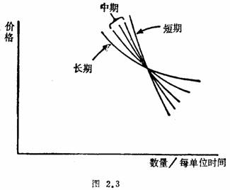 在需求曲线上“时间”起着三个不同的作用。首先,横轴衡量每单位时间的数量,例如,每月每年对鞋的需求。时间的这种应用还使我们有可能描绘一条连续的曲线以表示如钢琴或房子这样的商品项目。这些商品的购买是以离散数量的方式进行的。其次,需求曲线上的各点应该看成是一些瞬间的选择。这个需求曲线是这一瞬间的快照,并且呈现了在可供选择的各种价格上可能购买的最大数量。在这种情况下,“时间”是作为“在给定的条件下”同义语来使用的。第三,需求曲线依赖于调整的时间长度。使用需求曲线的目的是为了便于分析供给变化的影响。然后,任何供给变化的影响将依赖于在需求曲线上允许做出的对时间长度的调整。在所有时期中最短的时期内,这时的条件只允许有非常小的变动,人们可以看到这时的需求曲线仅有最小的弹性。当允许条件变动的区间扩大时,人们将能够看到,这条需求曲线的弹性增加,如图2.3所示。