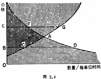 需求和供给曲线把相关的或可观测的价格-数量关系限制在图2.4中的一个三角形的、画有交叉影线的区域内。为了更加准确的表述这种关系,需要做不同制度上的假设。在自由市场,图2.4(A)上供给和需求表的交点具有特定的重要意义。在这个特定的价格上,也仅在这个价格上,需求者和供给者的愿望可以同时得到满足。在任何别的价格上,不是需求者要买的东西多于供给者要卖的东西(短缺),就是供给者要卖的东西多于需求者要买的东西(过剩)。在A点,需求和供给背后的潜在力量,而非需求和供给本身,建立起了一种能够平衡供给和需求数量的价格。