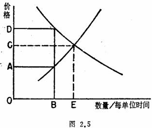 给汽车代销商。用图2.5可以表示这个过程。如果允许供给和需求背后大量自由活动,那么,均衡数量是在OE。均衡价格是在OC。在名义“牌”价OA时,供给量是OB,但消费者情愿付价格OD来取得OB的数量。结果产生了各种各样间接支付这种价格的形式。最终所付的价格(OD)高于均衡价格(OC),而且,供给量(OB)也低于价格如在OC时的数量(OE)。