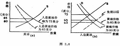 在分析对人造黄油实行免税的影响时,让我们画一条黄油价格保持不变的人造黄油需求曲线。如果黄油的供给是具有完全弹性的,则人造黄油的价格将下降,数量将上升;而黄油的数量将下降。图2.8中假定黄油的供给曲线不是具有完全弹性的。当人造黄油的价格从75美分降到65美分,黄油的需求曲线将移动,价格将从85美分降到80美分。不过,当黄油价格从85美分降到80美分时,人造黄油曲线也将移动,并且价格将降到63美分,这又使黄油需求曲线再一次移动,等等。如果这个过程持续足够长的时间,就可以取得如下联立方程式的解: