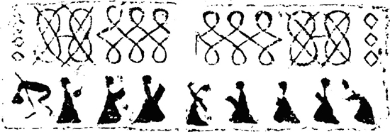 舞谱。舞谱是用来记录或者说是表示舞蹈队列和动作提示的一种专用图。敦煌发现的二卷唐人舞谱,是目前确认最早的舞谱。据我们分析,刻在开县东汉队列舞蹈图上的一幅图,是一幅提示9个舞伎队列变换的舞谱。两侧各3个菱形图符,示意队列呈菱形移动;中间的两个8字形内叉图符,示意队列8字型穿插;最内侧3个联体图符,示意队列按联体图形进行,也可能还表示3个人,分别交叉牵手。图符分左右两侧,明确指示出9个舞人,中间1人为领舞者,两侧各4人,围绕领舞者进行三种队列变换。由此可见汉代已有舞谱。(图三)