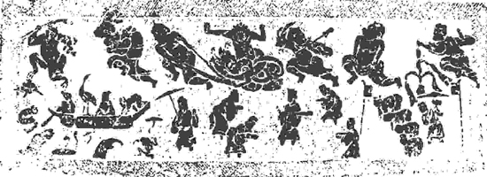 角抵之戏。《汉书·西域传》中载,汉代有漫衍鱼龙、角抵之戏的表演。漫衍鱼龙,是指戴着面具表演,也就是现代的假面舞,汉代叫“象人”。有的表演有故事情节,称为角抵戏,已具有戏曲的元素。戏中有人扮兽象的,就叫“象人奇戏”。四川出土画像砖、画像石石刻上,留下了极为珍贵的图像。1972年郫县出土的石棺画像,就刻有讲述“东海黄公”故事的角抵戏。张衡在《西京赋》里,记载了这个故事以及它的表演形式。黄公住在东海,从小精通武术,能翻江倒海、降龙伏虎。他不论到哪里,都佩带赤金做成的刀,驾着云彩,坐着山河,呼风唤雨,日行万里。到了老年,因饮酒过度,体力衰退,武术也大不如前。秦朝末年,有白虎在东海一带出没,黄公又像过去一样,提着赤金刀去降伏白虎,终因力不从心,被白虎咬死。图中有戴假面的黄公,有龙虎象人,还有熊面、豹面象人等,甚为生动。(图四上部)