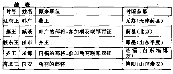 仔细研究这个表,就会发现项羽是一个毫无政治头脑的莽汉。他所建立的不是一个统一的国家,而是一个地位都互相平等的国际联盟,连邦联的资格都够不上。因为大家都是独立王国,在体制方面,项羽这个国王并不能高过别的国王。尤其是当我们注意上表那些新国王的原来职位,更会发现项羽处理这次分封,完全被他自己的喜怒和他左右那些三流角色的政客所操纵,所以自己为自己制造出来不必要的严重危机。像囗心,一个无权无势的小朝廷,项羽把他迁到一千公里外蛮荒的郴县(湖南郴州),囗心也顺服的听命之后,项羽仍不容他存在,派人把他杀掉。像刘邦,项羽应该依囗心的初约,封他当秦王,至少也要把他封到距家乡较近的地区,满足刘邦与刘邦部下的思乡心理,这对项羽并没有损失。但项羽仍记得刘邦比他先进入咸阳的大恨,而把刘邦驱逐到当时人们都认为是蛮荒的南郑(陕西汉中)。像齐王田市,非常热心的派遣他的大将田都率领军队参加项羽的联军西征,田都即令有功,正常的情形应该是由项羽对田都加以赏赐,遣送回国,由国王田市再予擢升。可是项羽却卖弄他的权威;把田都封为齐王,而把本来的齐王田市逐出国都临淄(山东淄博东),贬到偏僻的即墨(山东平度)当胶东王。对燕王国跟赵王国,也都如此。后来更把韩王韩成当作罪犯一样的捉住杀掉,致使韩成的智囊张良投奔刘邦,跟项羽作对到底。中国有句谚语说:“天下本来不乱,是低能的人把它搞乱的。”正是项羽的写照。 ——有一件事也可帮助我们对项羽的了解,当时一位学者蔡生,建议项羽建都咸阳(陕西咸阳),因为咸阳具有最适中的位置,可以统御全国。项羽拒绝采纳,他说:“富贵不回故乡,好像穿了漂亮的衣服在黑夜里走路。”项羽的目的只是在向他的乡人们炫耀他的富贵,所以坚持返回东方。蔡生告诉朋友说,“人们都说:项羽像一个穿人衣戴人帽的猴子,果然不错。”这话传到项羽耳朵,项羽就把蔡生投到巨锅中煮死。 西楚王国只缔造了两个月,战争就重新爆发。 旧齐王田市的宰相田荣,首先发兵迎击他的旧同僚新齐玉田都。旧赵王赵歇的宰相陈余,也发兵攻击他的老友新任常山王张耳。但项羽认为这些叛逆在自掘坟墓,他的强大兵力,可以贯彻他的任何荒谬政策。他先攻击田荣,准备消灭田荣后,挥军西上,再消灭陈余。田荣果然不堪一击,兵败身死,项羽纵兵大肆屠杀,人民为了保护自己的生命财产,不得不集结起来武装抵抗,叛乱随着项羽不断的军事胜利而更加扩大,西楚兵团陷于疲于奔命的泥沼。田荣的弟弟田横率领的新集结起来的齐兵团,开始跟项羽进行捉迷藏游击战。 远在西方万山丛中的汉王刘邦,抓住这个机会,悄悄从南郑(陕西汉中)出发,越过秦岭山脉,把故秦王国领土上项羽所建的一些封王,一鼓荡平。然后大军东征,并为那个可怜的牧羊人囗心发丧,号召全国共同讨伐项羽的弑君之罪。 纪元前二○五年四月,刘邦攻陷项羽的首都彭城(江苏徐州)。 项羽得到彭城陷落的消息,立即放弃田横,亲率三万人的精兵南下反攻。汉军大败,仅只被挤到谷水、泅水溺死的就有十余万人,溃退到灵壁(安徽濉溪)。西楚兵团的追兵赶到,汉军再大败,被挤到濉水溺死的又有十余万人。两次战役,说明项羽用兵的灵活和勇猛。 刘邦达到荥阳(河南荥阳),西楚兵团把荥阳团团围住,水泄不通。刘邦狼狈不堪,他的部将纪信伪装刘邦的模样,开东门出降。刘邦乘着楚军狂欢呼号万岁,因而戒备松懈之际,从西门悄悄逃走。刘邦自己虽然受到一连串的挫败,但他派出去的大将韩信却用兵如神,进入黄河以北之后,把黄河以北项羽所建的一些封王,如西魏玉、常山王、代王、燕王、殷王,以及使项羽疲于奔命的田横所辖的故齐王国地区,只几个月工夫,就把他们一一征服。 西汉王朝赖三个杰出的人物而建立,即大将韩信、智囊张良、后勤总司令萧何。韩信是故楚王国的一个穷苦的流浪汉,张良是故韩王国贵族的后裔,萧何是故秦王朝县政府的低级官员。假如不是时代动乱,他们只有淹没在人海之中。韩信曾当过项羽禁卫军的低级军官,为项羽当过卫兵,屡次向项羽献计献策,项羽都不能采纳。唯英雄才能识英雄,项羽只是一员勇敢的将领,不是政治家,所以他不能了解韩信,犹如小学生不能了解大学生的课程一样。项羽不但对韩信失之交臂,对他唯一的智囊,被尊称为“亚父”的范增,也不能容忍,终于把范增逐出政府。只有刘邦具备当时所有领袖们都没有的才能,他在黑社会中培养出来的高度智慧和宽宏度量,使三个杰出的人物为他效力,使他自己成为中国历史上第一位平民出身的伟大君主。 荥阳战役之后,战争成胶着状态、项羽不断的进攻,刘邦不断的失败。刘邦几乎是每战每败,但他像一头苍蝇一样,失败后兜了一个圈子,收拾残军,又转回来战斗。萧何的后勤工作是第一流的,他坐镇首都栎阳(陕西临潼),刘邦在前方从来不缺少粮食和兵源补充。而扫荡黄河以北的韩信,于占领了故齐王国地区后,开始抄掠项羽的后路。项羽不久就陷于求战不能,求胜更不能的苦境。 九十年代纪元前二○三年,项羽要求和解,只有和解才能救他。结果双方同意以鸿沟(赢政大帝开凿的运河)为界,瓜分世界,鸿沟以西归汉,鸿沟以东归西楚。 签约之后,项羽大大地舒了一口气,把所俘虏的刘邦的父亲送还给刘邦,率领大军东归,以为从此可以休息一段时间。然而,刘邦