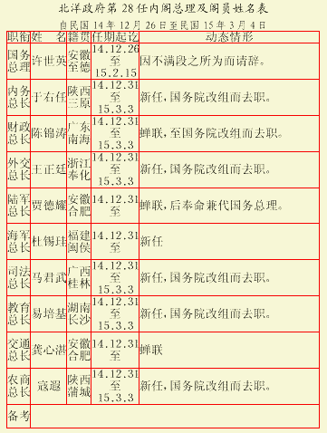 北洋政府第28任内阁总理及阁员姓名表
