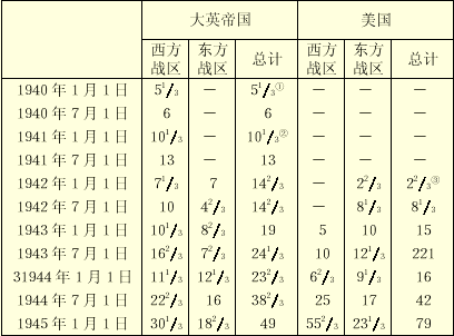 ①英国驻法远征军。 ②不包括在阿比西尼亚的游击队。 ③不包括菲律宾军队。 东方战区和西方战区的分界线画在一条通过卡拉奇的南北线。 以下各地·没·有当作作战地区: 印度西北边境、直布罗陀、西非洲、冰岛、夏威夷、巴勒斯坦、伊拉克、叙利亚。 (1941年7月1日除外)。 马耳他岛作为一个作战地区,从1942年1月到1943年7月,阿拉斯加也作为一个作战地区。 外国分遣队——如自由法国人、波兰人、捷克人——没有包括在内。 我作的另外一个比较表明:大不列颠和大英帝国人员的牺牲甚至比我们英勇的盟国人员的牺牲还要大。英国武装部队的死亡、失踪、被认为是已死亡的人数共达三十万零三千二百四十人,再加上各自治领、印度和各殖民地的十万零九千人,总数达四十一万二千二百四十人。这个数字还未包括联合王国国内死于空袭的六万零五百平民,也未包括大约三万名死亡的商船船员和渔民。与这些数字相比,美国陆军、空军、海军、海军陆战队和海岸警卫队牺牲的人数是三十二万二千一百八十八人①。我之所以列举这些令人伤心的光荣牺牲的人数,是深深相信由这么多宝贵的鲜血所凝成的平等的战友关系,将继续博得英语世界的人们的崇敬,并鼓舞他们的行动。 ①艾森豪威尔:《欧洲十字军》,第1页。 在海洋上,美国当然肩负了太平洋战争的几乎全部重担,1942年,他们在中途岛附近、在瓜达卡纳尔岛以及在珊瑚海所进行的决定性战役,使他们在那辽阔的海洋上获得了全部的主动权,给他们打开了袭击所有被日本占领的地方的道路,并最后袭击日本本土。美国海军是不能同时在大西洋和地中海承担重任的。在这里我有责任摆明事实。在欧洲战区、大西洋和印度洋上击沉的七百八十一艘德国潜艇和八十五艘意大利潜艇中,有五百九十四艘是英国海军和空军击沉的;英国海军和空军除了击毁或俘获意大利全部舰队外,还消灭了德国的全部战舰、巡洋舰和驱逐舰。 把击毁的潜艇数字列表如下:
