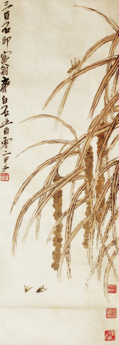 齐白石的花鸟画最为世人称道, 他既能作细如毫发的工笔草虫, 又善画简而又简的粗笔大写意, 有时将这两种方法和形式结合起来, 创造出奇妙、精绝的“鱼虫花卉”。此《秋实图》笔简而意俱到,画家从精微处着手,将挺立在枝叶上的螳螂和麦穗下双飞的彩蝶,描绘得风姿生动,意趣横生,极富表现力和感染力,构图也很奇巧,右边饱满而左边空旷,空白处签上“三百石印富翁白石五百零二甲子”,使画面显得整体疏宕,节奏感极强。