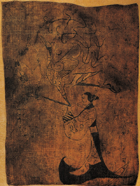 又名《晚周帛画》、《夔凤美女图》,1949年出土于湖南长沙陈家大山一座战国楚墓中。“帛画”是指古代绘在丝织物上的图画。画中描写一端庄高髻的妇女侧身而立,双手合掌,细腰,袖口宽松,长裙曳地,体态优美。妇女的上方画一只展翅飞舞的凤和一条蜿蜒向上升腾的龙。根据当时楚国的习俗并结合文物考证,此画的妇女形象即是墓主人,作品的主题是表现龙凤引导死者即墓主人灵魂升天。人物合掌祝祷,神态庄重虔诚,处于静态;与动态的龙和凤形成对比,使整个画面构成对比中的和谐。此画在丝织品上以墨线勾勒,用笔流畅。