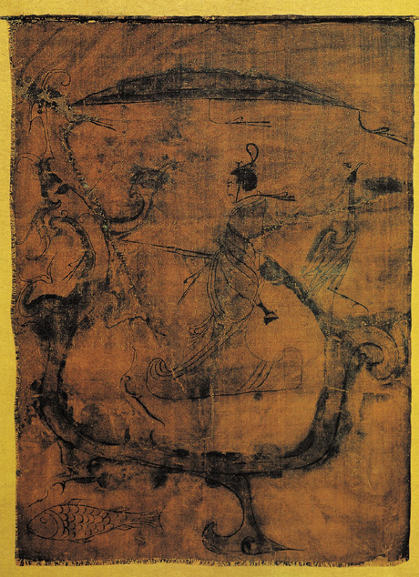 又名《驭龙图》。这是1973年清理湖南长沙子弹库楚墓遗址时发现的又一幅战国帛画。画面正中描绘一高冠蓄须男子,侧身直立,腰佩长剑,衣衫飘动,精神抖擞地手执缰绳驾驭着一条巨龙;龙形似舟,昂首向前,龙尾部站着一只白鹭;龙的身下有鲤鱼。人物头顶正中画有舆盖,三条飘带随风拂动。画中男子为墓主人。作品主题也是表现“升天”,不过不是由龙凤引导,而是由墓主人驾驭飞龙升天。画中人、龙和鱼都向左行进,与向右飘动的人物衣衫、手执的缰绳以及舆盖上的三条飘带,构成画面上极强的动感,很好地表达出人物乘龙迎风挺进的意境,希望墓主人的灵魂快速进入天国。墓主人的侧面肖像,更具写实特征,这很容易使人想起当时屈原的诗句:“带长铗之陆离兮,冠切云之崔嵬。”