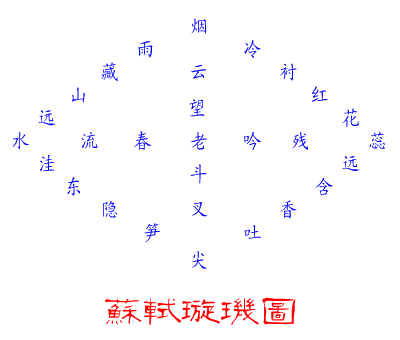 菱形,外圈任取一字开始,左旋右旋,读之皆可,能得五言绝句三十首