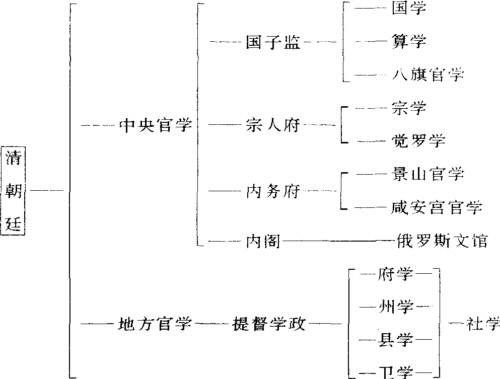 从顺治元年(公元1644年)到道光二十年(公元1840年)近200年间,清代的学校教育基本上是沿袭明代旧制,亦分为中央官学和地方官学两大类。