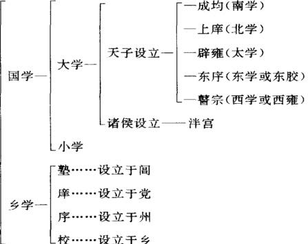 设在王都的小学、大学,总称之为国学。设在王都郊外六乡行政区中的地方学校,总称之为乡学。据《礼记·学记》,西周的乡学是:“家有塾,党有庠,术(遂)有序。”《周礼》又说:“乡有庠,州有序,党有校,闾有塾。”《孟子》仅说:“周曰庠。”