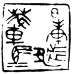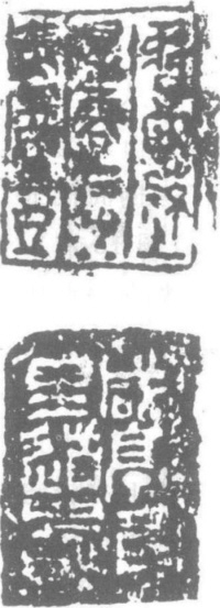 前面我们提到,早在新石器时代的陶器上,已经发现有刻写或绘写的某些图形符号,有的文字学家认为已经具有文字性质,可以说是原始陶文。近几十年的考古发掘,发现了许多战国时期的陶文,其中齐国的最多,燕、秦、滕、邾〔zhu朱,即邹〕等国次之,韩、赵、魏、楚等国也有零星出土。这些战国陶文,有刻写的,也有范印的。所谓范印,就是如同钤盖印章,有的正方,有的长方,有的圆形,内容大都只是标明制作年份、地点,监造者、陶工籍贯姓名、置用地点等,字体大多工整,但不同地区的形体风格有所不同,图14是两枚陶文拓片,上面一方是齐国陶文,释文为: “扈者(都)[上陳下土]〔chen陈〕[得字去彳](得)再左里[白攴]〔po破〕亳豆。”扈都,地名;[上陳下土]得再,监造者姓名;左里,陶工籍贯;[白攴],陶工名;毫,器物置用地名;豆,一种装食物的器皿。下面一方是秦国陶文,释文为:“咸亭右里道器。”咸,地名,即咸阳;亭,行政区划名;右里,地名,陶工道的籍贯;道,陶工名;器,指器物。