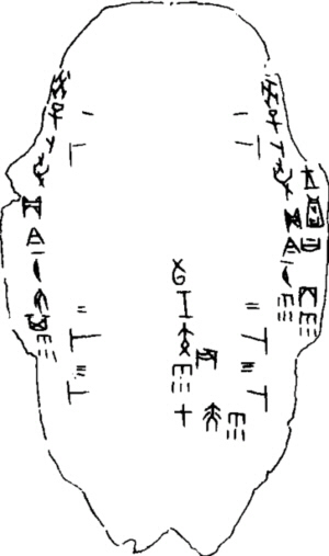 商王非常迷信,特别崇尚鬼神,无论大事小事,如年成、征伐、生育、出游乃至田猎等等,都要进行占卜,专门设有一种官职 (后世称为贞人)主管占卜。有时商王还亲自动手占卜。当时占卜用的主要材料和方法是: 使用经过整治加工的乌龟腹甲或兽类(主要是牛)的肩胛骨,在反面挖或钻出圆形和椭圆形的槽;占卜时用火在这些槽内烧灼,使正面相应的部位出现裂纹,根据裂纹的数目和形状(叫做“兆”)推断卜问事项的凶吉和结果。在整个占 卜活动及事情的进行结束之后,就把上述情况用文字写刻在龟甲或兽骨的一定部位,作为验证。这些文字,称为卜辞,所以甲骨文又常称为“殷墟卜辞”。