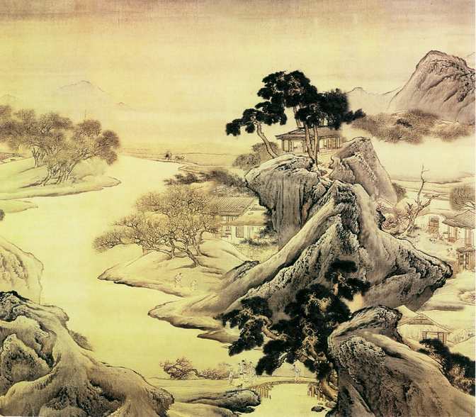林尽水源,便得一山,山有小口,仿佛若有光。便舍船,从口入。初极狭,才通人。复行数十步,豁然开朗。土地平旷,屋舍俨然,有良田美池桑竹之属,阡陌交通,鸡犬相闻。其中往来种作,男女衣著,悉如外人;黄发垂髫,并怡然自乐。