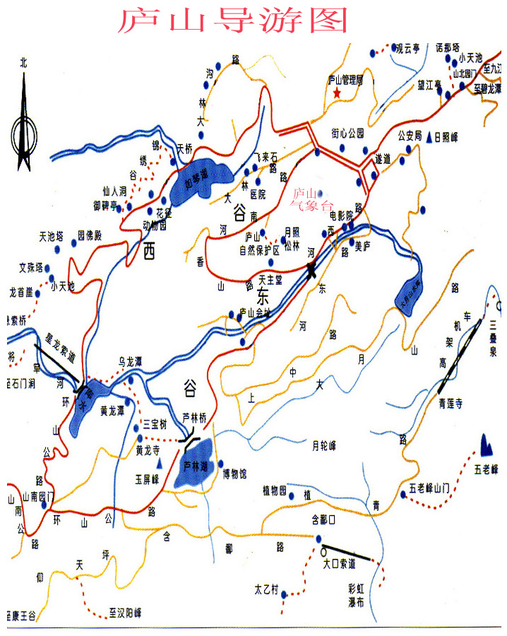 庐山在江西省北部,北临长江,东濒鄱阳湖,一山独峙,群峰峥嵘,自然景色优美,是自古以来著名的游览避暑胜地。庐山不但风景好,而且交通方便,这是它在我国名山中所具有的优势。从九江乘汽车,沿曲折的山路,一个多小时即可抵山上的中心区牯岭。山麓四周公路环绕,四通八达;山上,主要风景点亦通汽车,旅游称便。庐山以大汉阳峰最高,海拔1474米。